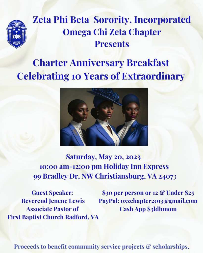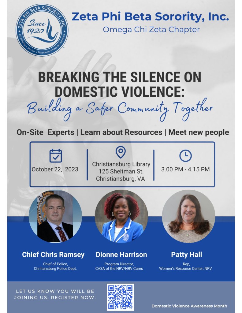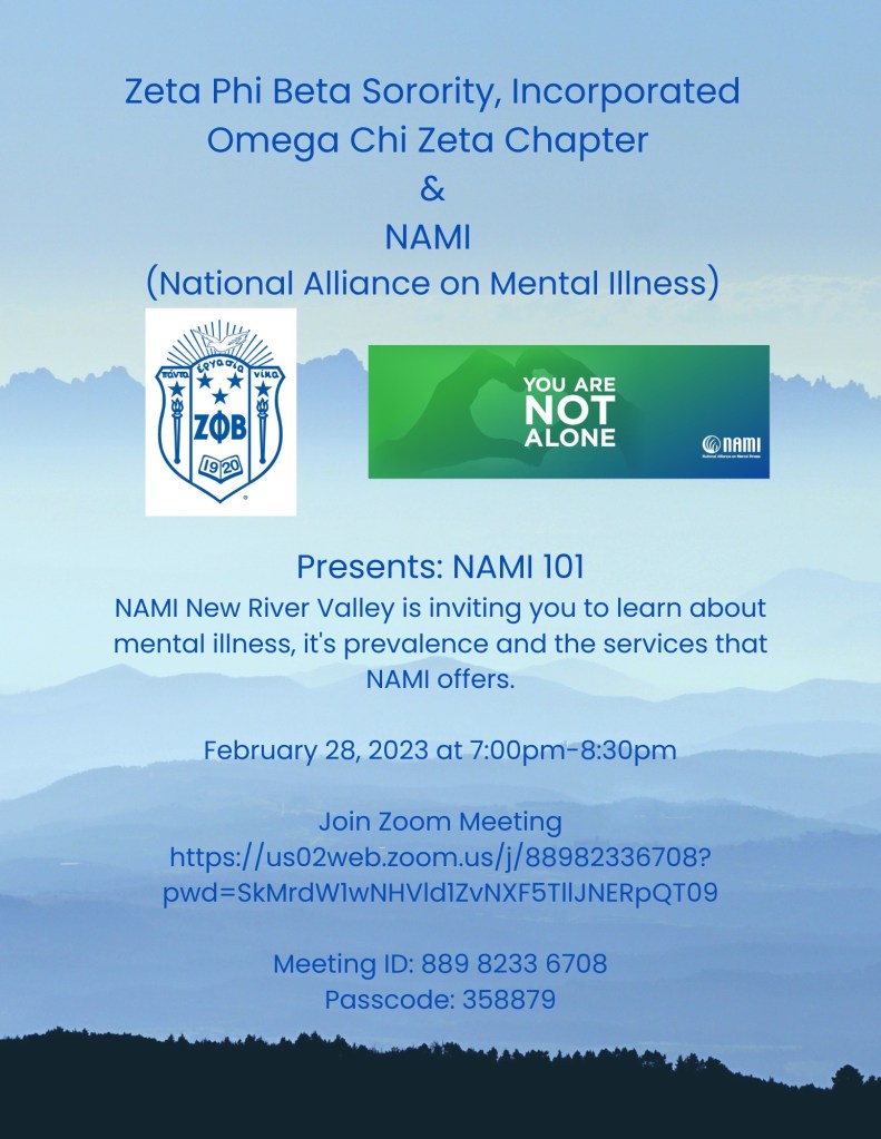 “Zeta Sings the Blues,” an international Mental Health Initiative, is a capstone program established by Zeta Phi Beta Sorority, Incorporated to increase awareness and fight the stigma of mental health. The Omega Chi Zeta Chapter partners with the New River Valley branch of the National Alliance on Mental Illness to destigmatize mental illness, provide awareness, and educate the community.